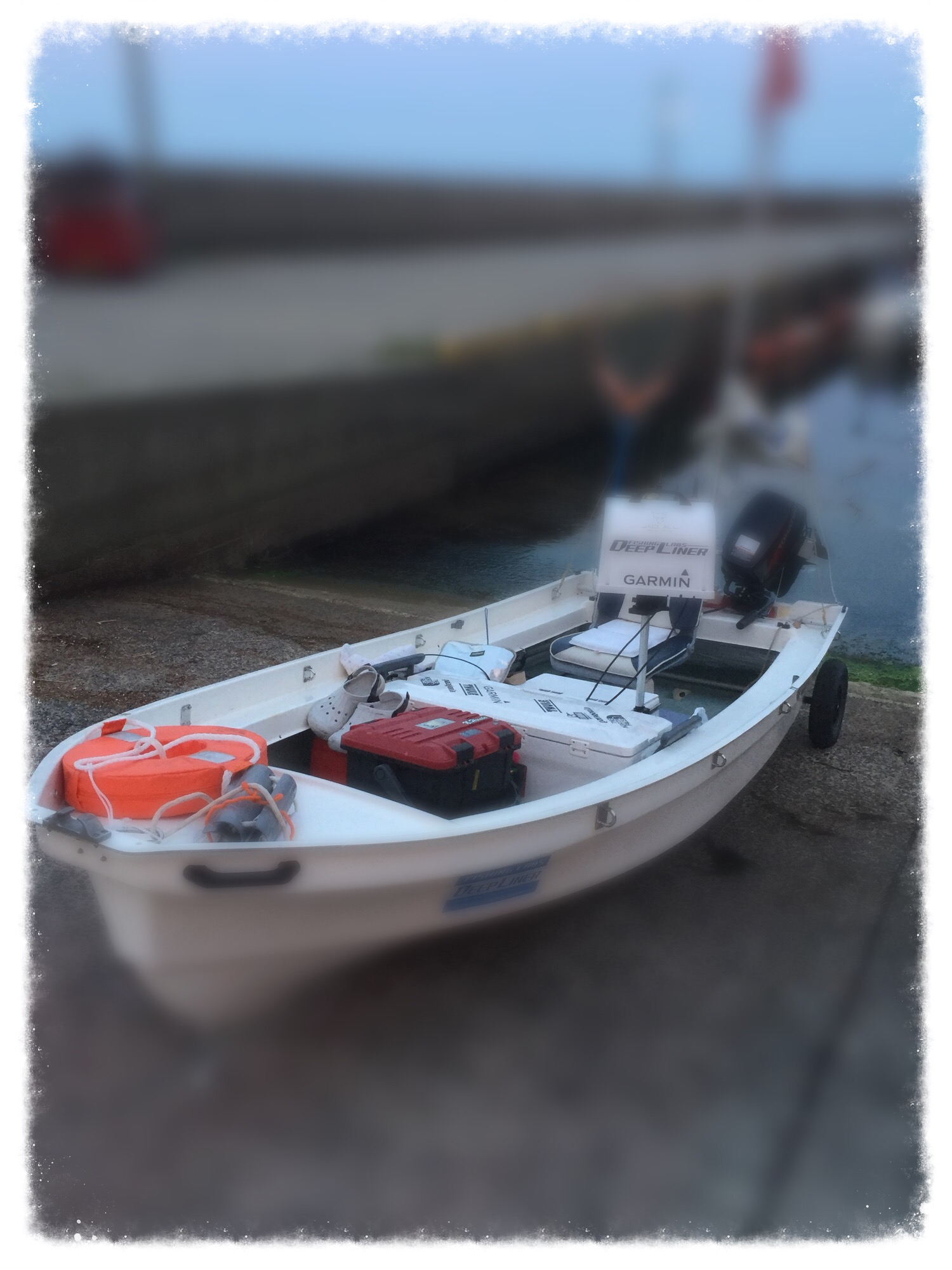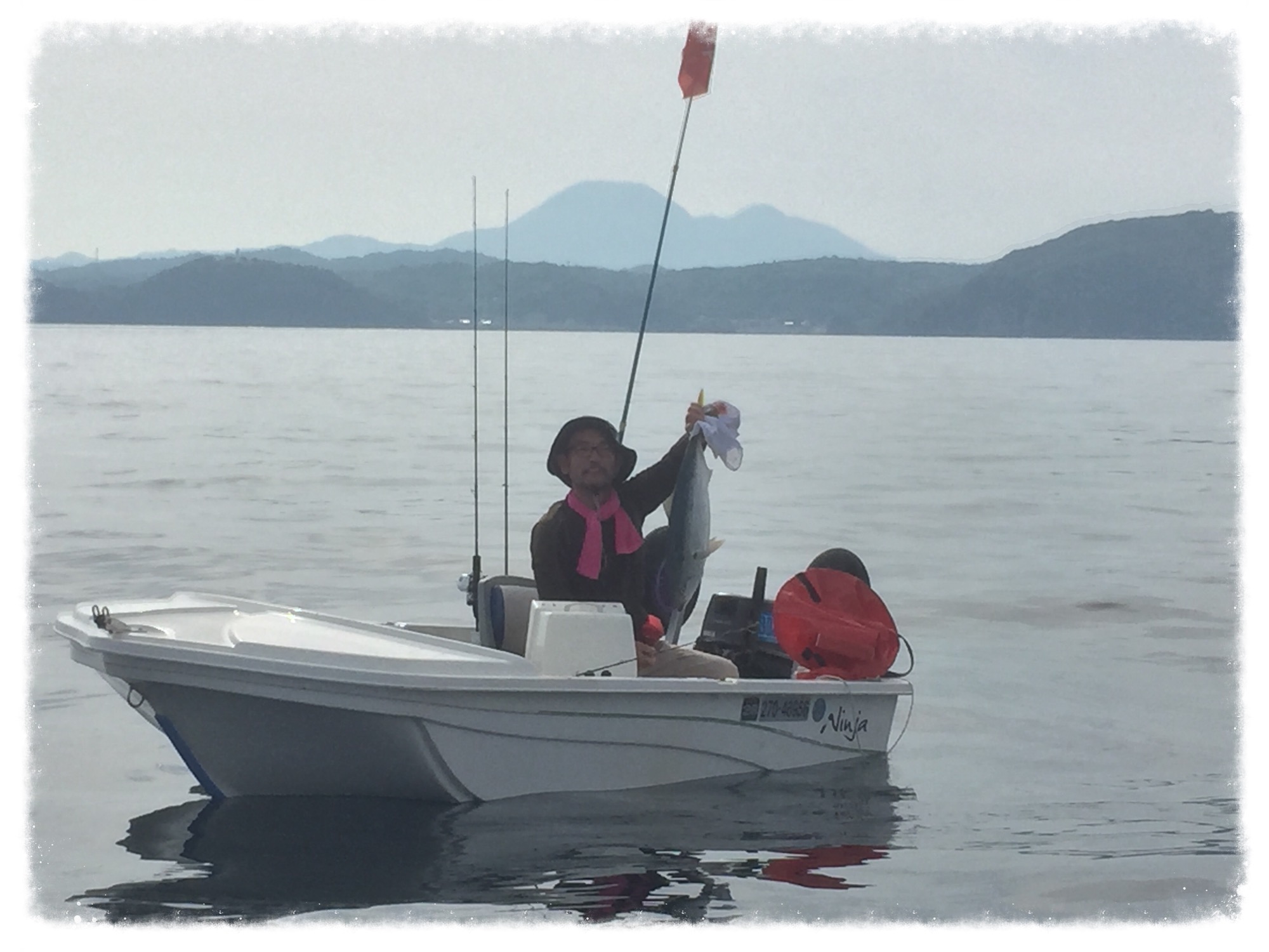 釣り仲間さんのボート…認識旗に鯉のぼりにカープのステッカー…