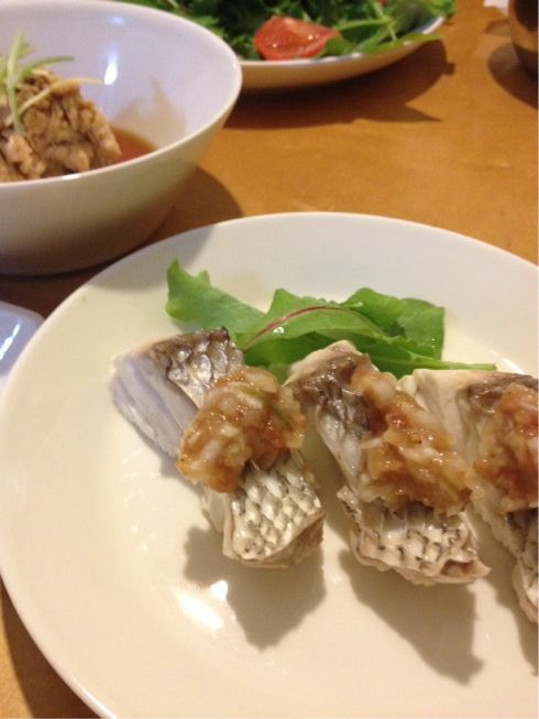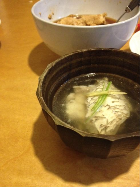 二日目 昆布締め、酒蒸し梅ネギソース、真子と肝の炊いたん、あら汁