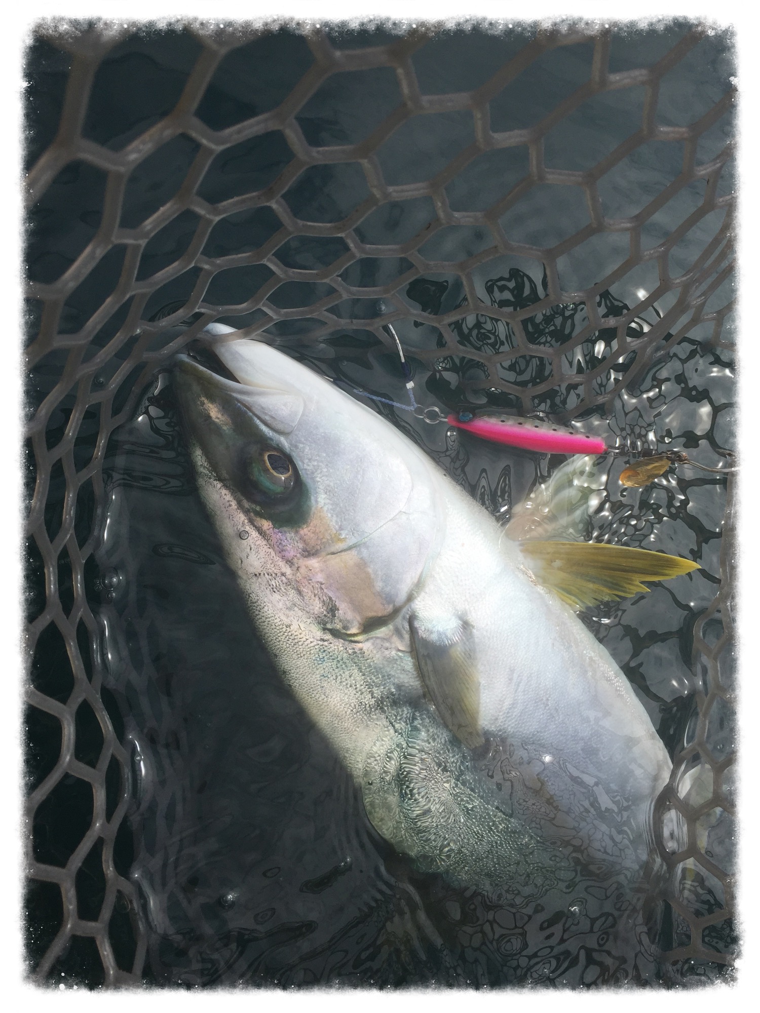 イサキ狙いなので水深20〜40mの根周りを探りました。メタルマルや小さなジグをブレードシングルフックチューンにして底から全レンジただ巻き、リーダー見える手前まで巻いてます。